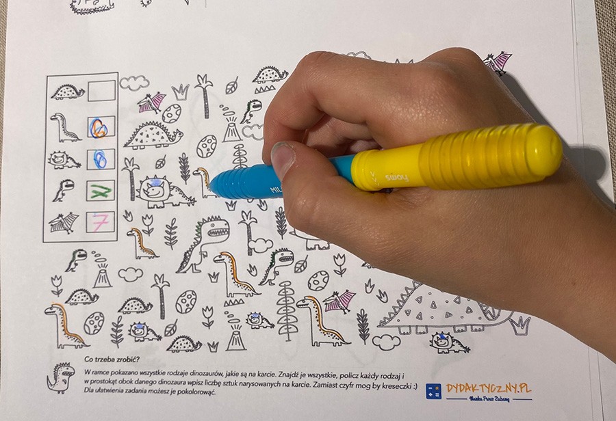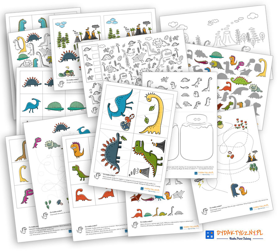 10 Kart Pracy do Ćwiczenia Spostrzegawczości + Gra Dino-Memory to zestaw różnorodnych zadań dla przedszkolaków, dzięki którym poćwiczą swą spostrzegawczość, koordynację ręka-oko i umiejętności liczenia: